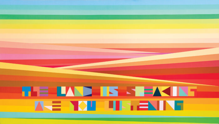 Stylized text plays an important part in Gibson’s practice. Often addressing environmental or social concerns, the short, powerful, and lyrical phrases come from various sources. Sometimes Gibson writes the words himself, as he did for THE LAND IS SPEAKING | ARE YOU LISTENING, which expresses frustration with those who recklessly abuse and neglect our ailing planet. In other instances, the phrases come from songs by artists ranging from Culture Club to Stevie Wonder to Frankie Valli. This exhibition includes paintings, prints, and sculptures that contain such phrases as “THE FUTURE IS PRESENT,” “I AM A RAINBOW TOO,” and “KNOW YOU’RE MAGICK BABY.”