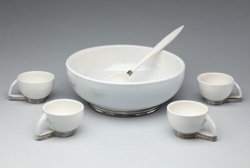 Paul Schreckengost, designer (American, 1908–1983); Gem Clay Forming Co., manufacturer (Sebring, Ohio, 1907–1960s). Punch bowl, ladle, and cups, 1938– 39. Ceramic, bowl: 4 1/2 x 12 x 12 in.; ladle: 1 1/4 x 12 x 3 in.; cups: 2 3/4 x 5 x 3 3/4 in. Collection Kirkland Museum of Fine & Decorative Art, Denver, CG0718; CG0719–CG0722; 2004.3040. Image courtesy of Kirkland Museum of Fine & Decorative Art, Denver. Photo: Wes Magyar
