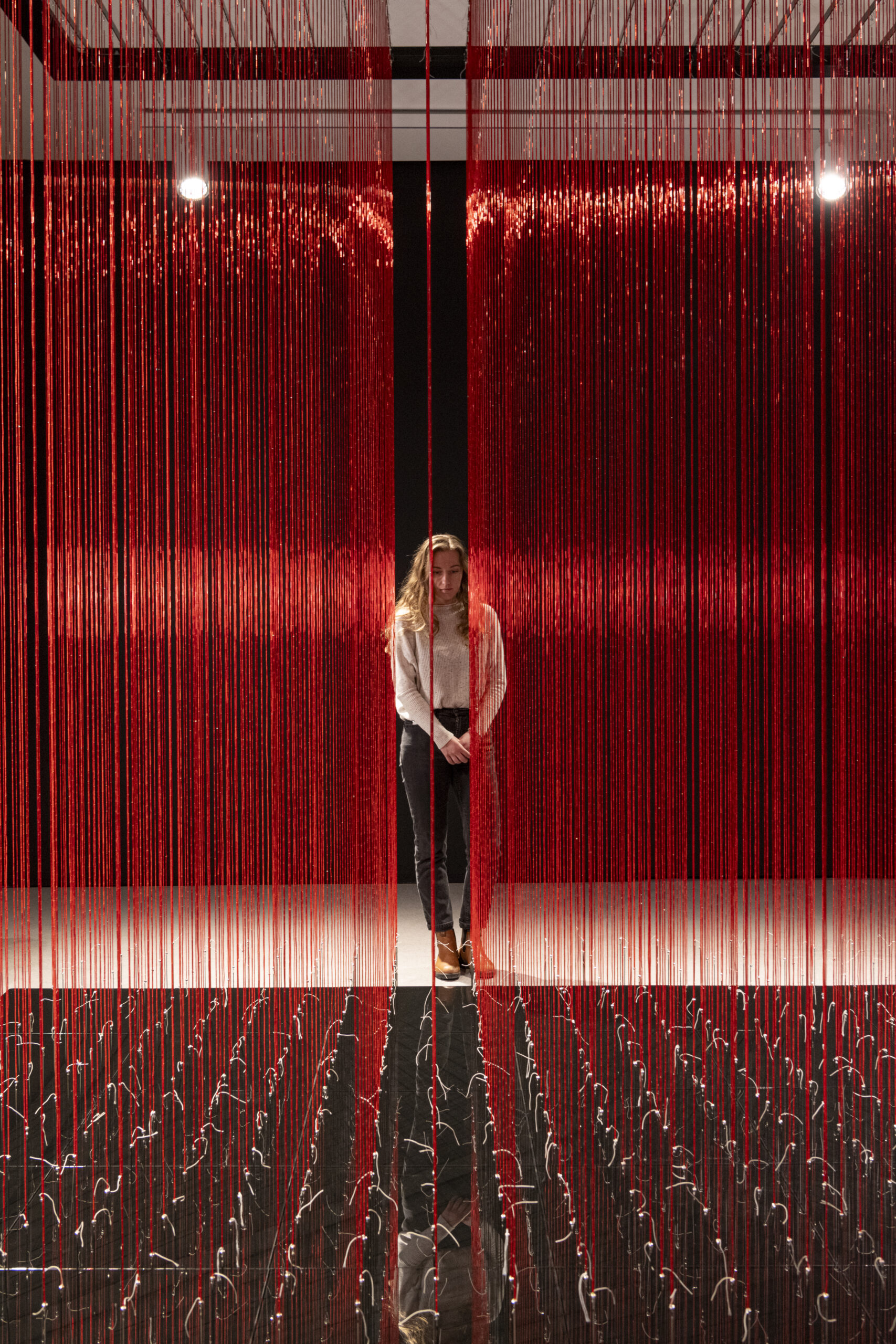 Anila Quayyum Agha. A Flood of Tears (Gathering Storms) (detail, installation view), 2010/2023. Upholstery needles, bugle, and hematite beads, braided cotton, wood, steel and glass; 144 x 144 x 156 in. Collection of the artist. Image courtesy of The Westmoreland Museum of American Art. © Anila Quayyum Agha