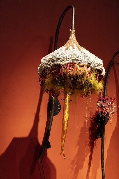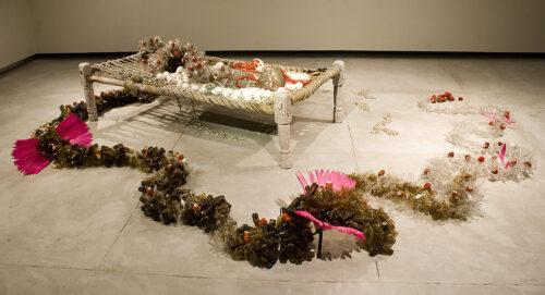 Banerjee is a voracious gatherer of objects. Reflecting the history and symbolism of items acquired from around the world, her constructions include things like cowrie shells, Chinese umbrellas, Pyrex tubes, glass beads, alligator heads, and epoxy buffalo horn replicas. Their strong colors, patterns, and frequent allusions to South Asian materials and images recall Banerjee’s Indian heritage while telling a larger story about the transmission, exploitation, and adaptation of cultures from colonial times to the global present.