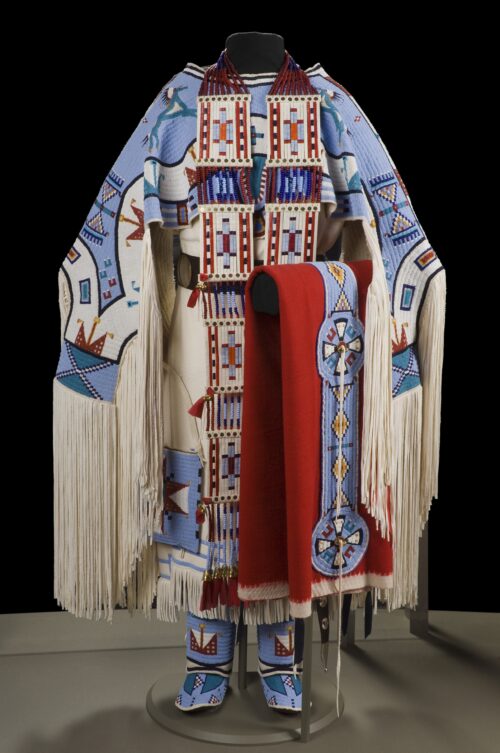 Joyce Growing Thunder Fogarty (Dakota/Nakoda), Juanita Growing Thunder Fogarty (Dakota/Nakoda), and Jessa Rae Growing Thunder (Dakota/Nakoda). Give Away Horses (dress and accessories), 2006. Deer hide, glass beads, canvas, thread, leather, moose hide, German silver, porcupine quills, feathers, elk hide, brass bells, ribbon, silk ribbons, and brass thimbles. National Museum of the American Indian, 26/5818–5821