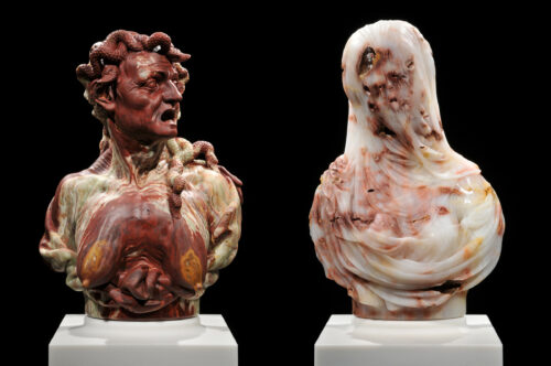 Barry X Ball (American, b. 1955). Envy / Purity, 2008–12. Envy—Pakistani onyx and stainless steel, 23 x 17 1/4 x 9 1/2 in. Purity—Mexican onyx and stainless steel, 24 x 16 1/2 x 11 1/4 in. Pedestals: Macedonian marble, stainless steel, wood, acrylic lacquer, steel, nylon, and plastic, 45 x 14 x 12 in. each. Collection of Mike DePaola, New York. © Barry X Ball