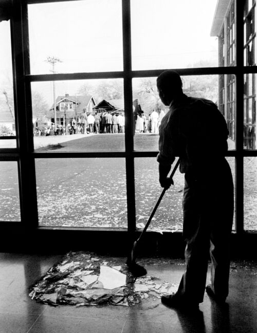Silhouetted against disaster, John Thomas Martin wields his broom, sweeping up the fragments of glass from shattered windows in the Meharry Medical College alumni building. In the background, a curious crowd gathers at the bombed home of Z. Alexander Looby. The bombing of the house shattered 147 windows at the college. April 19, 1960. Photo by Joe Rudis. Courtesy of The Tennessean