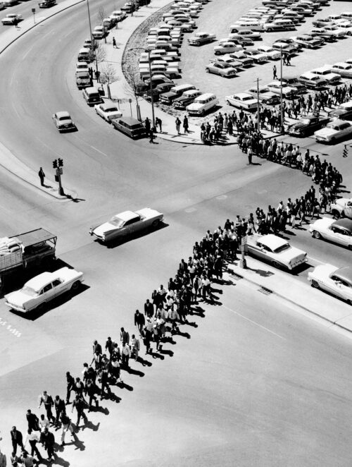 Like a giant serpent, a line of black college demonstrators wound its way around the courthouse area, coming out from Jefferson Street and James Robertson Boulevard on April 19, 1960, the day of the Z. Alexander Looby bombing. They marched three abreast, with the line stretching across ten blocks. Photo by Eldred Reaney. Courtesy of The Tennessean