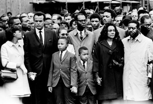 On April 8, 1968, mourners got ready for a silent march from Clayborn Temple to Memphis City Hall in Memphis. From left to right: Yolanda King, Harry Belafonte, Martin Luther King III, Dexter King, Coretta Scott King, and the Reverend Ralph Abernathy, King’s successor. Rev. Jesse Jackson stands behind the widow. Photo by Bill Preston. Courtesy of The Tennessean